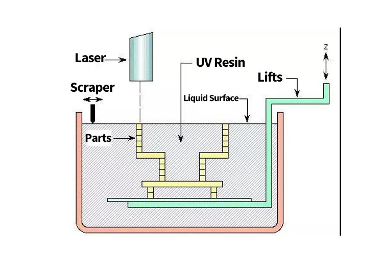 Stereolithography (SLA) mainly uses photosensitive resins as raw materials, and utilizes the property that liquid photosensitive resins can be cured rapidly under the irradiation of ultraviolet laser beams. The photosensitive resin is generally in a liquid state, and it immediately causes a polymerization reaction under the irradiation of a certain wavelength of ultraviolet light (250 nm to 400 nm), and completes the curing. The printing consumables that SLA technology can currently use are photosensitive resins, which are mainly used to manufacture a variety of molds, models, etc.; it is also possible to add other components to the raw materials to replace the wax molds in investment precision casting with SLA prototypes.